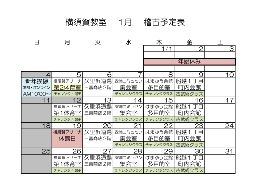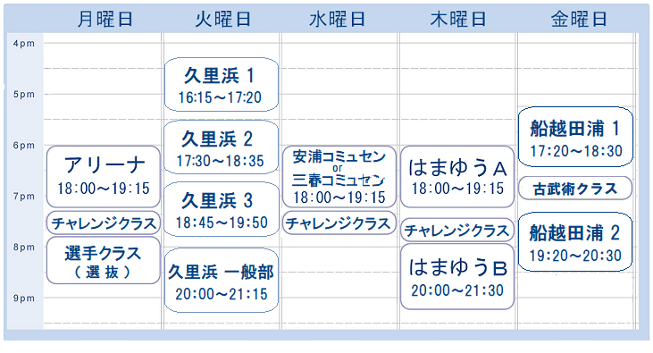 17:15〜18:25 通常稽古18:40〜19:10 チャレンジC 19:20〜20:30 通常稽古2